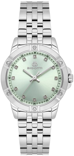 Женские наручные часы Bigotti Quotidiana BG.1.10563-1. Корпус и браслет выполнены из нержавеющей стали. Размер - 32мм. Циферблат мятного цвета. Украшен кристаллами. Стрелки с люминесцентным покрытием. Класс водозащиты - 3 АТМ. Плавать в данной модели не рекомендуется