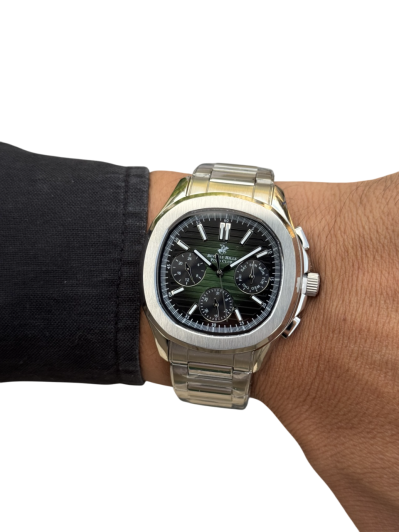 Глубокий цвет темно-зеленого циферблата притягивает взгляд и создает ощущение спокойствия и уверенности. Люминесцентное покрытие стрелок и меток позволяет легко считывать время даже в условиях плохой освещенности.