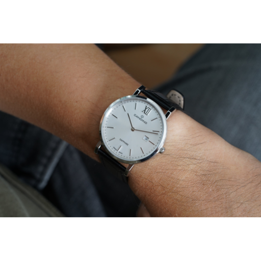 Элегантный белый циферблат в сочетании с высококачественным ремешком из коровьей кожи создают гармоничный образ, подходящий для любого стиля одежды, от делового до повседневного.