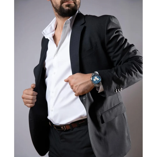 - синий циферблат с узором Sunray, с тремя белыми субдисками,