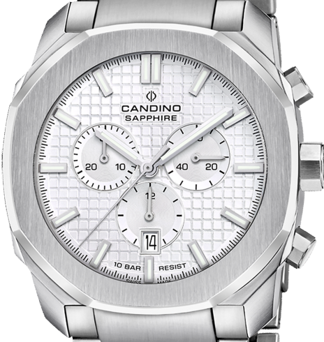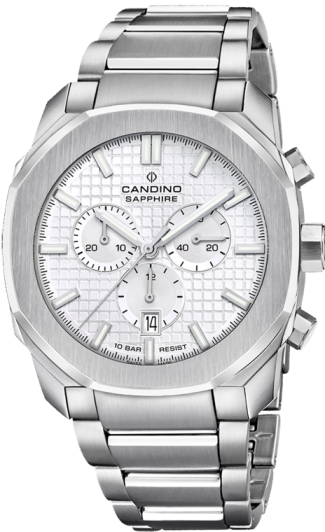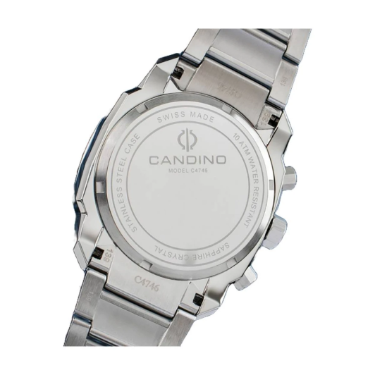 Швейцарские мужские наручные часы-хронограф Candino Chronos Carree C4746/5 серебристого цвета с белым циферблатом и белыми индексами обеспечивает идеальную читаемость показаний благодаря сапфировому стеклу.