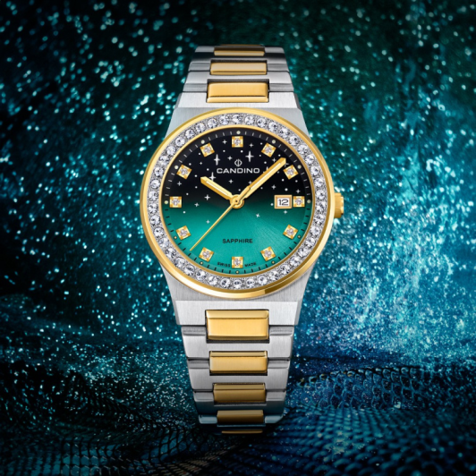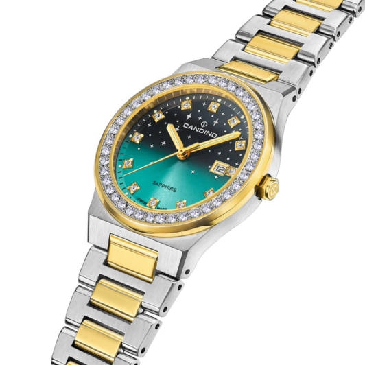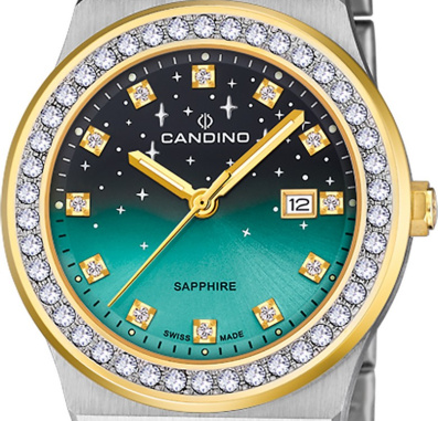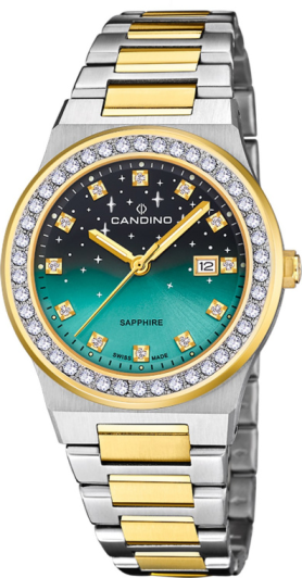 Модель Candino C4750/2 имеет уникальный градиентный циферблат в сочетании с очаровательными элегантными часовыми и минутными стрелками и часовыми метками, инкрустированными камнями, что создает роскошный и привлекающий внимание общий вид.