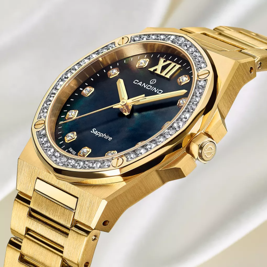 Цирконы также инкрустированы по периметру корпуса и красиво мерцают при каждом движении запястья.