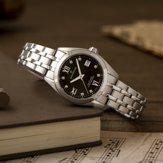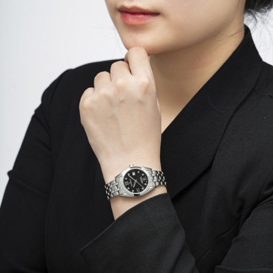 Изысканный черный циферблат служит идеальным фоном для выразительных стрелок, которые четко и легко считываются, придавая модели не только стиль, но и практичность.