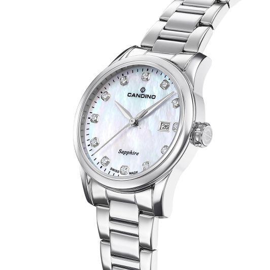 Молочно-белый перламутровый циферблат притягивает взгляд своим нежным сиянием, создавая ощущение утонченности и стиля. Апертура даты, расположенная на отметке «3 часа», добавляет практичности, позволяя всегда быть в курсе текущего времени.