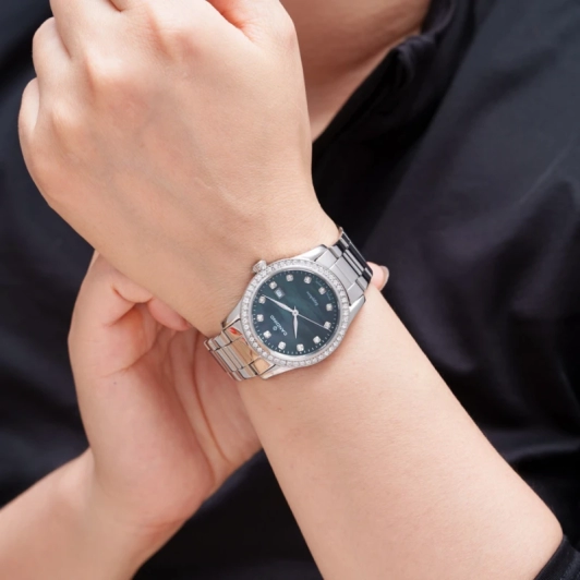 Главная изюминка этих часов – это уникальный перламутровый циферблат черного цвета, который обладает неповторимым рисунком и переливами, что делает их по-настоящему особенными. Накладные индексы и римские цифры серебряного цвета изящно выделяются на фоне темного перламутра, обеспечивая отличную читаемость времени и создавая элегантный контраст.