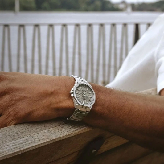 - текстурированный циферблат с метками в виде штрихов защищен прочным сапфировым стеклом;