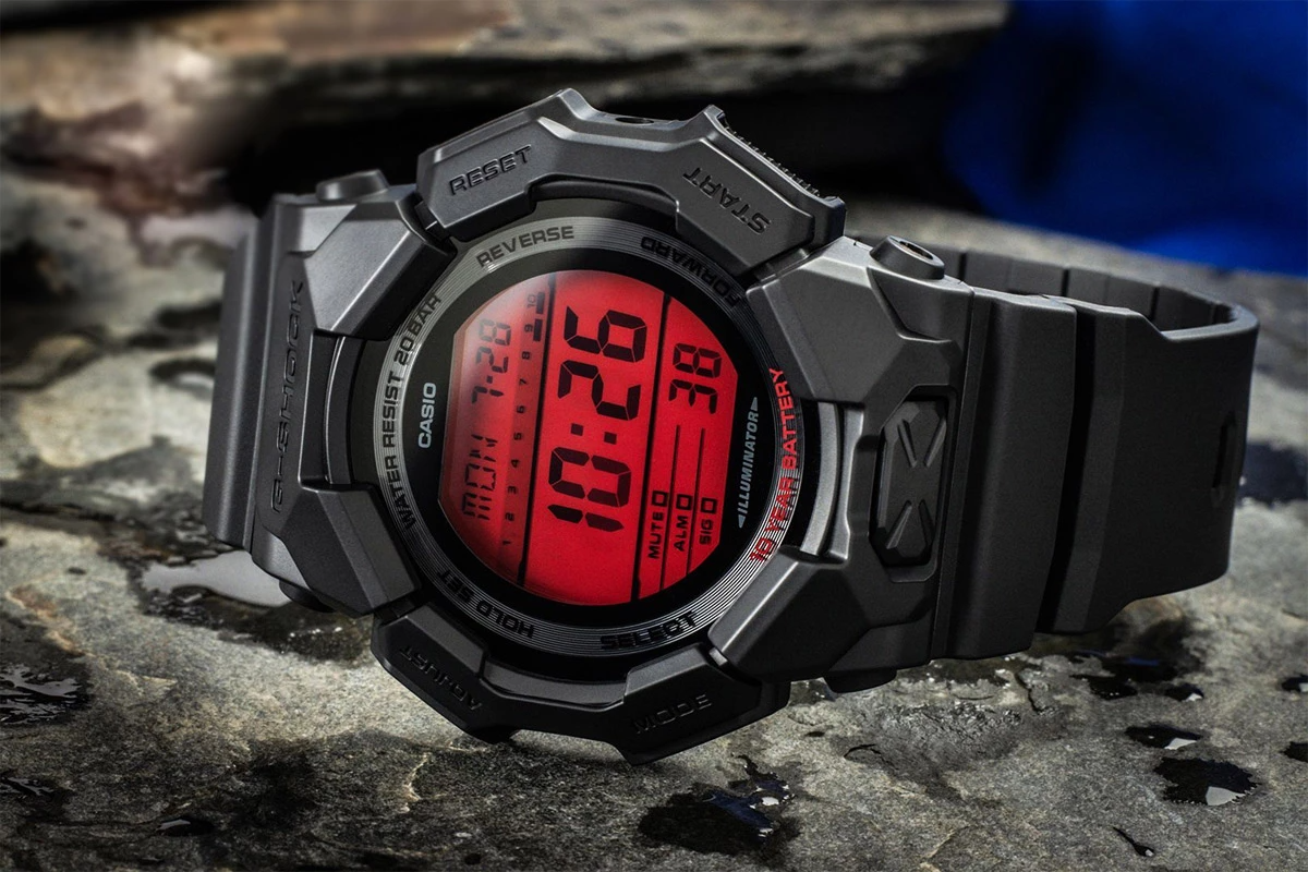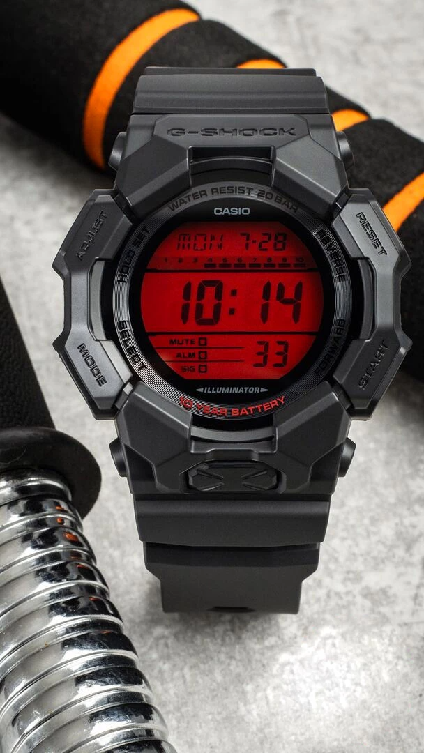 Часы Casio G-Shock GD-010BBR-1 - лимитированный релиз 2025 года в полностью черной стелс-расцветке с необычным красным дисплеем из цифровой серии G-SHOCK GD-010 в крупном брутальном матовом корпусе на полимерном ремешке.