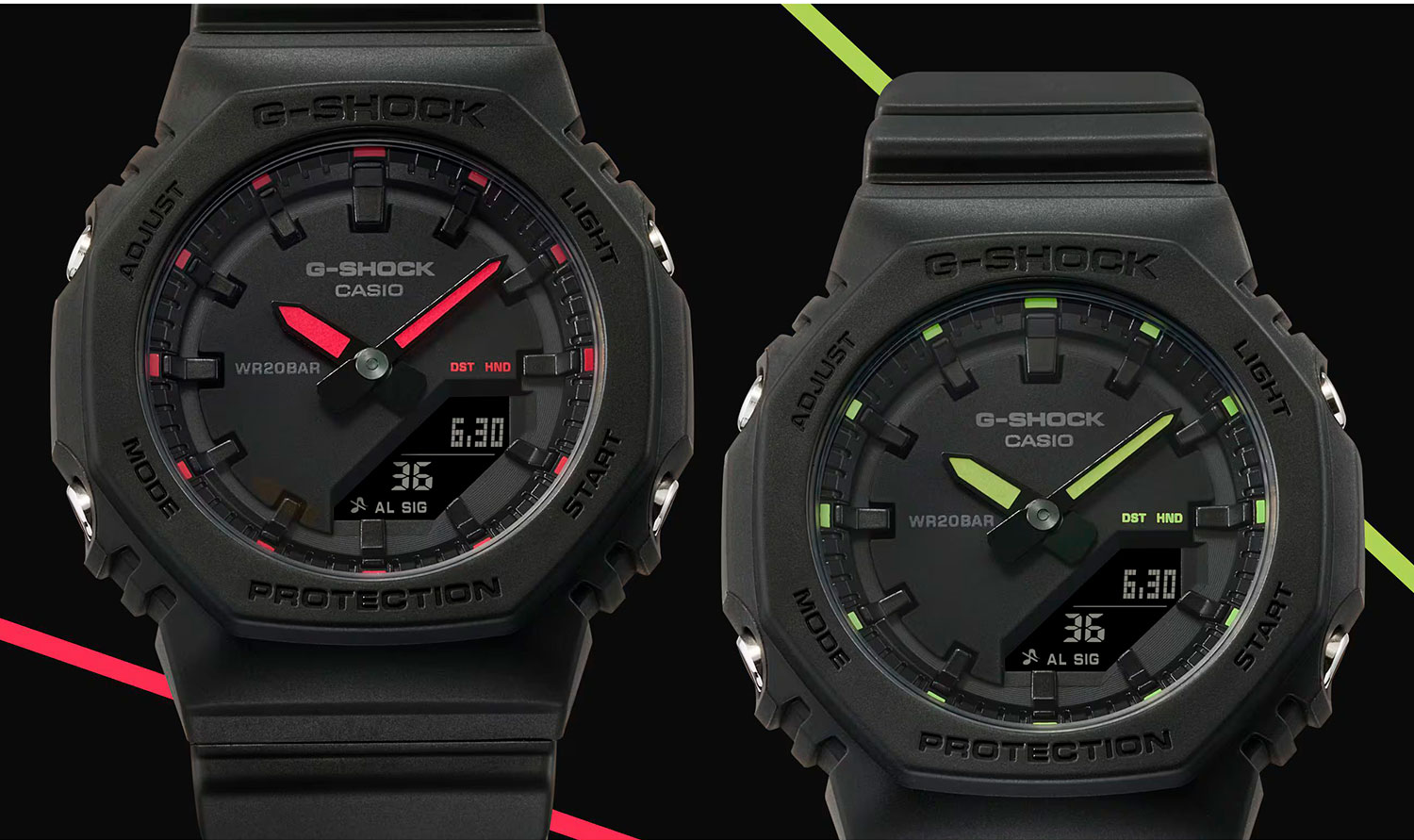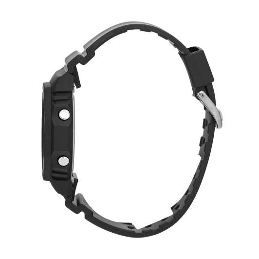 Стильная и лаконичная компактная модель в полностью черном октагоновом корпусе на полимерном ремешке с яркими желто-зелеными деталями циферблата.