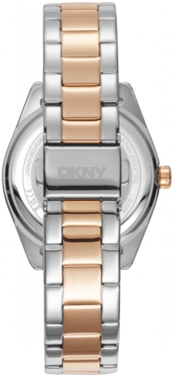 - серебристый циферблат украшен крупным золотистым логотипом DKNY и золотистыми часовыми стрелками;