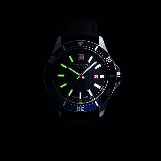 - циферблат украшен рельефным декоративным узором в виде вертикальных линий и дополнен фирменным логотипом Swiss Military Hanowa в положении 12 часов;