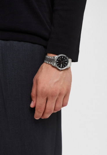 Под прочным минеральным стеклом расположен циферблат черного цвета с окошками даты и дня недели в положении 3 часов. Класс водонепроницаемости 5 Бар защищает корпус от брызг или капель дождя.