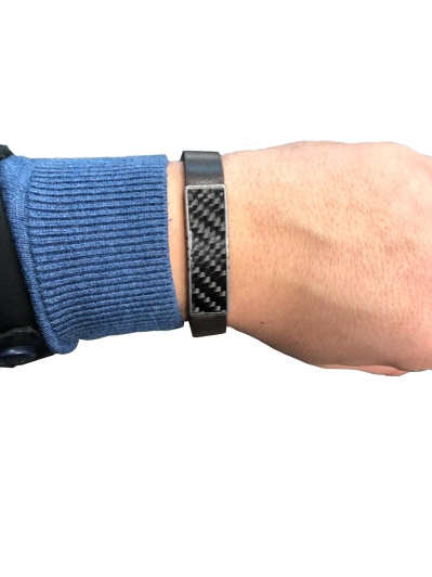 - в центре браслета расположена вставка с текстурой под карбоновое волокно, обрамленная металлической рамкой;