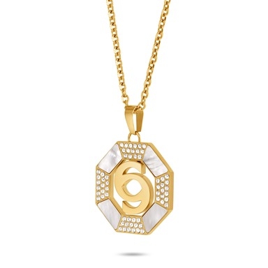 Особую изысканность колье придает инкрустация перламутром по контуру кулона. Этот натуральный материал с нежным переливающимся блеском создает деликатный ореол вокруг логотипа, добавляя украшению женственности и утонченности. Перламутр символизирует чистоту, нежность и мудрость, придавая колье особый смысл.